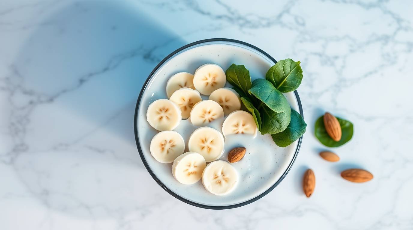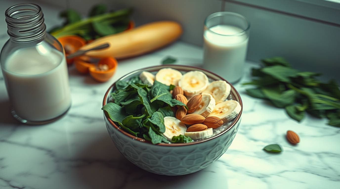 Start by gathering frozen bananas, spinach, and almond milk. These ingredients will serve as the creamy foundation of your smoothie bowl.