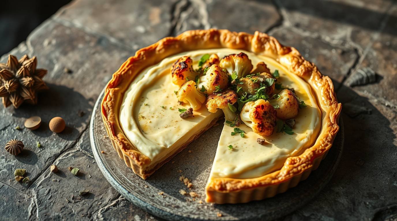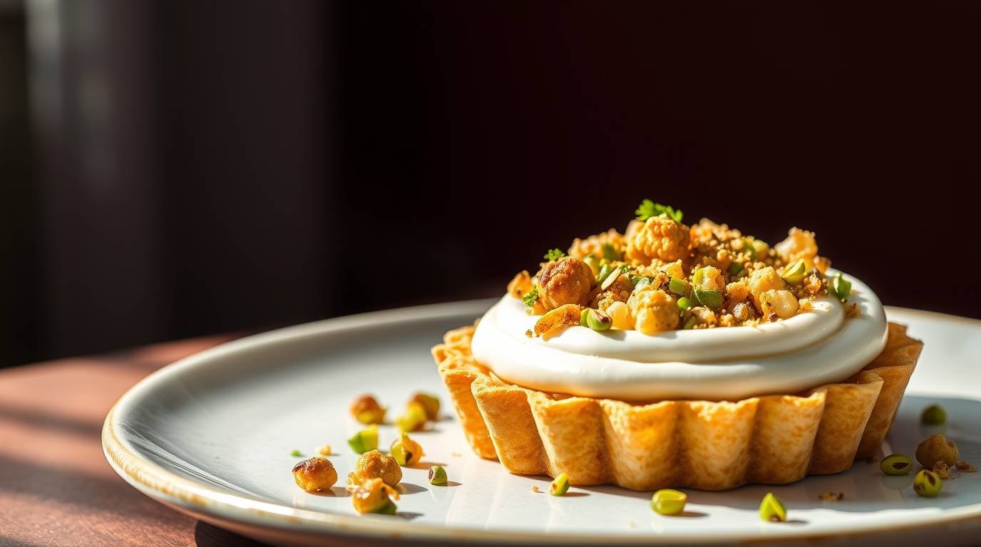 Cauliflower Mechoui Tart with Labneh Mousse & Pistachio Dukkah is a vibrant, gourmet dish that beautifully marries the earthy flavors of roasted cauliflower with creamy labneh and the nutty crunch of dukkah. This tart is not just a feast for the palate, but also a visual delight, combining an array of textures and colors that elevate it to a culinary masterpiece.