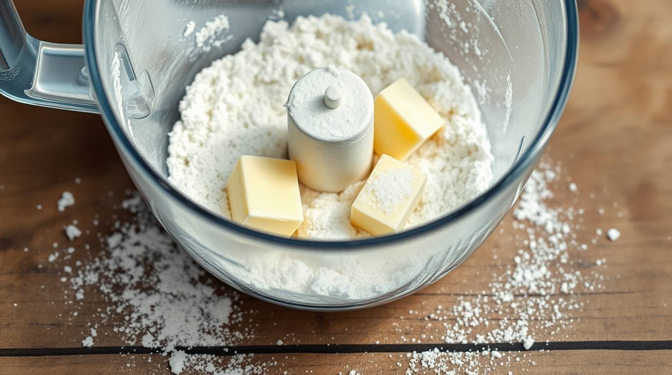 In a food processor, combine flour, salt, and cold diced butter. Pulse until the mixture resembles coarse crumbs. Gradually add cold water, one tablespoon at a time, until the dough starts to come together. Shape it into a disk, wrap it in plastic wrap, and chill in the fridge for at least 30 minutes.