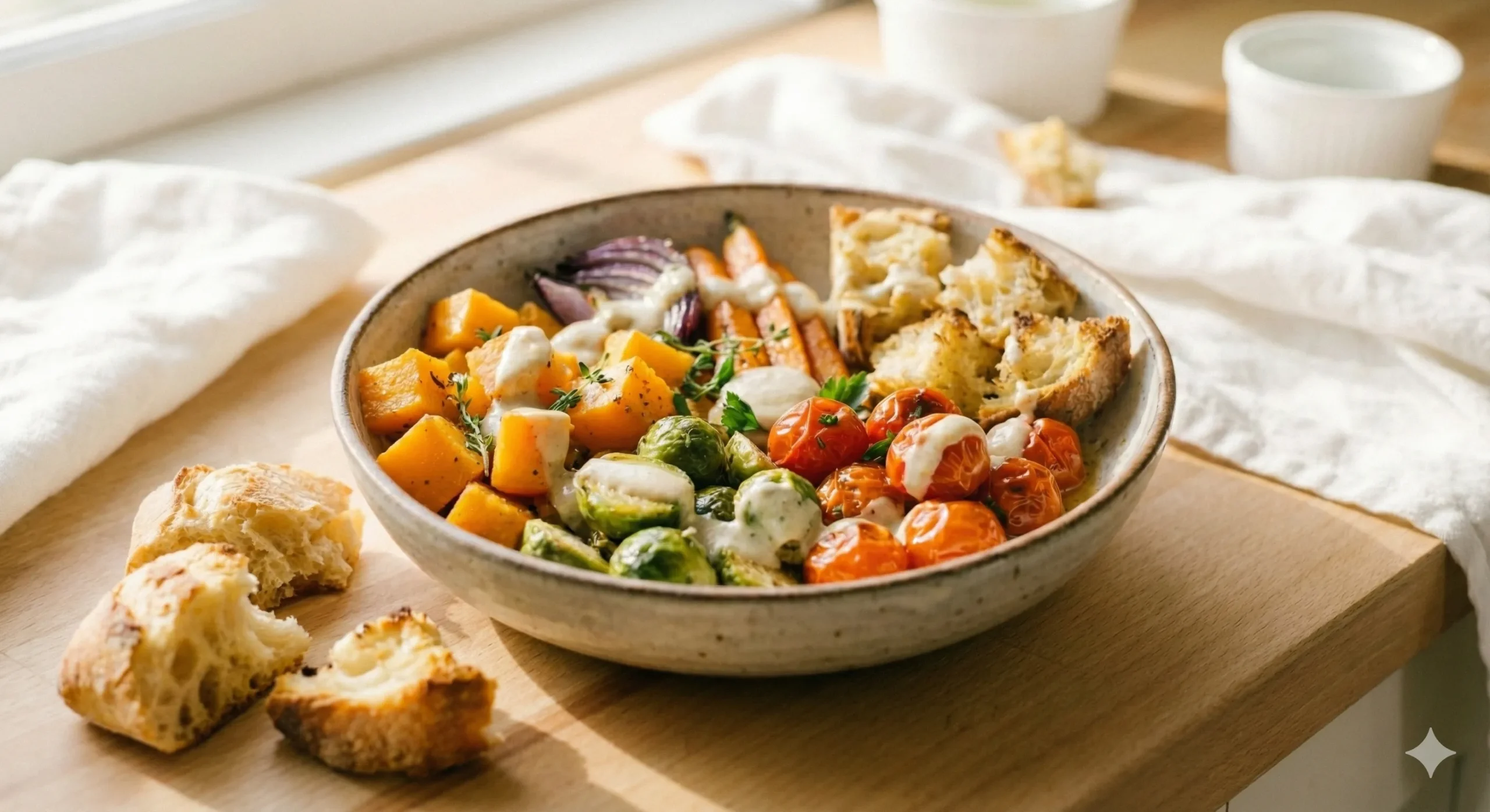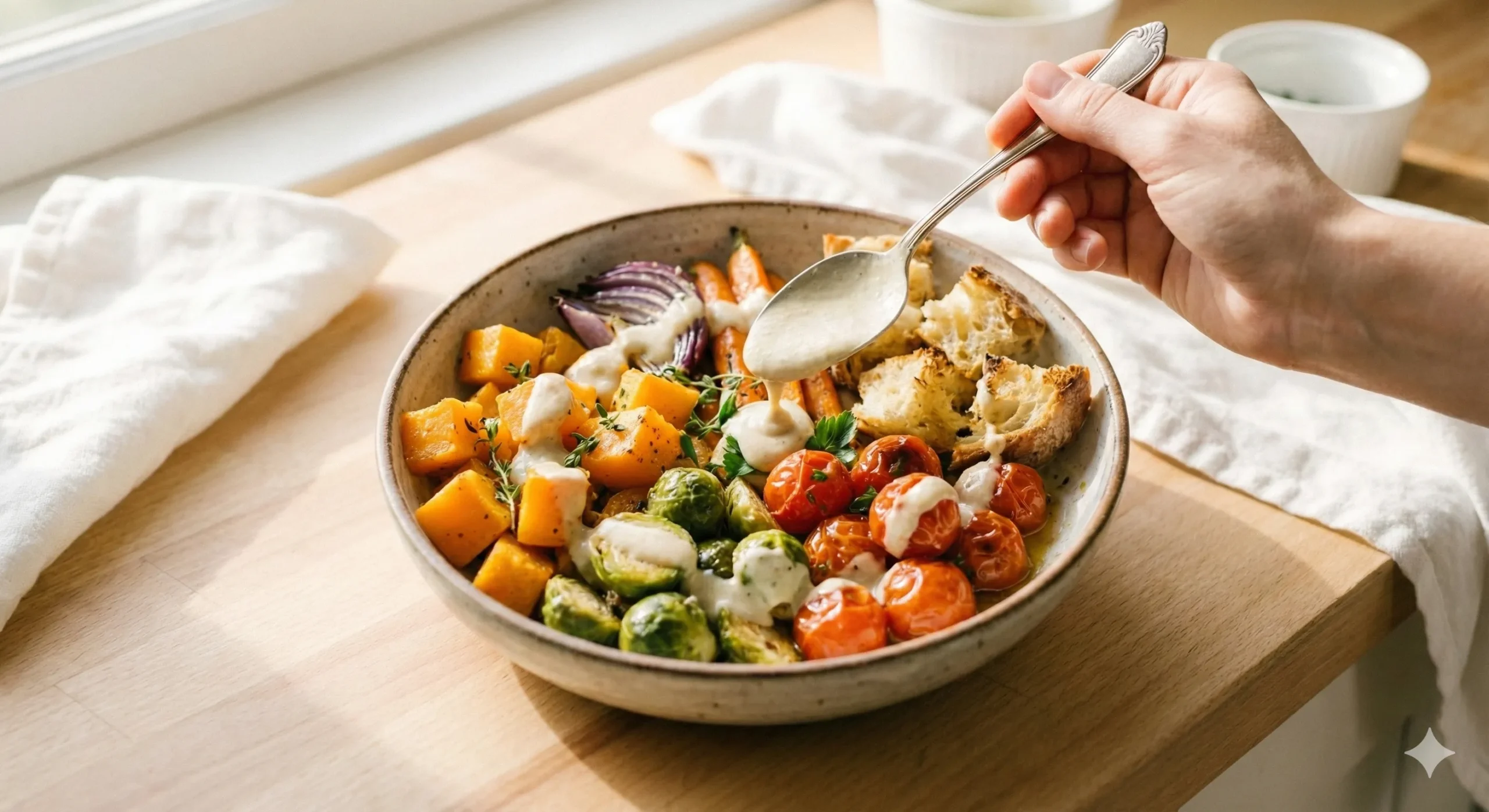This cozy winter bowl brings together caramelized seasonal vegetables, sweet cherry tomatoes, and a silky tahini–lemon drizzle. Simple, grounding, and naturally uplifting, it’s perfect for an easy, one-pan meal with big flavor and minimal effort.