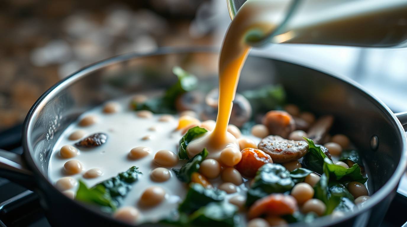 Add the rinsed white beans to the skillet. Pour in your choice of cream option (oat milk, light cream, or unsweetened soy milk), stirring to combine.