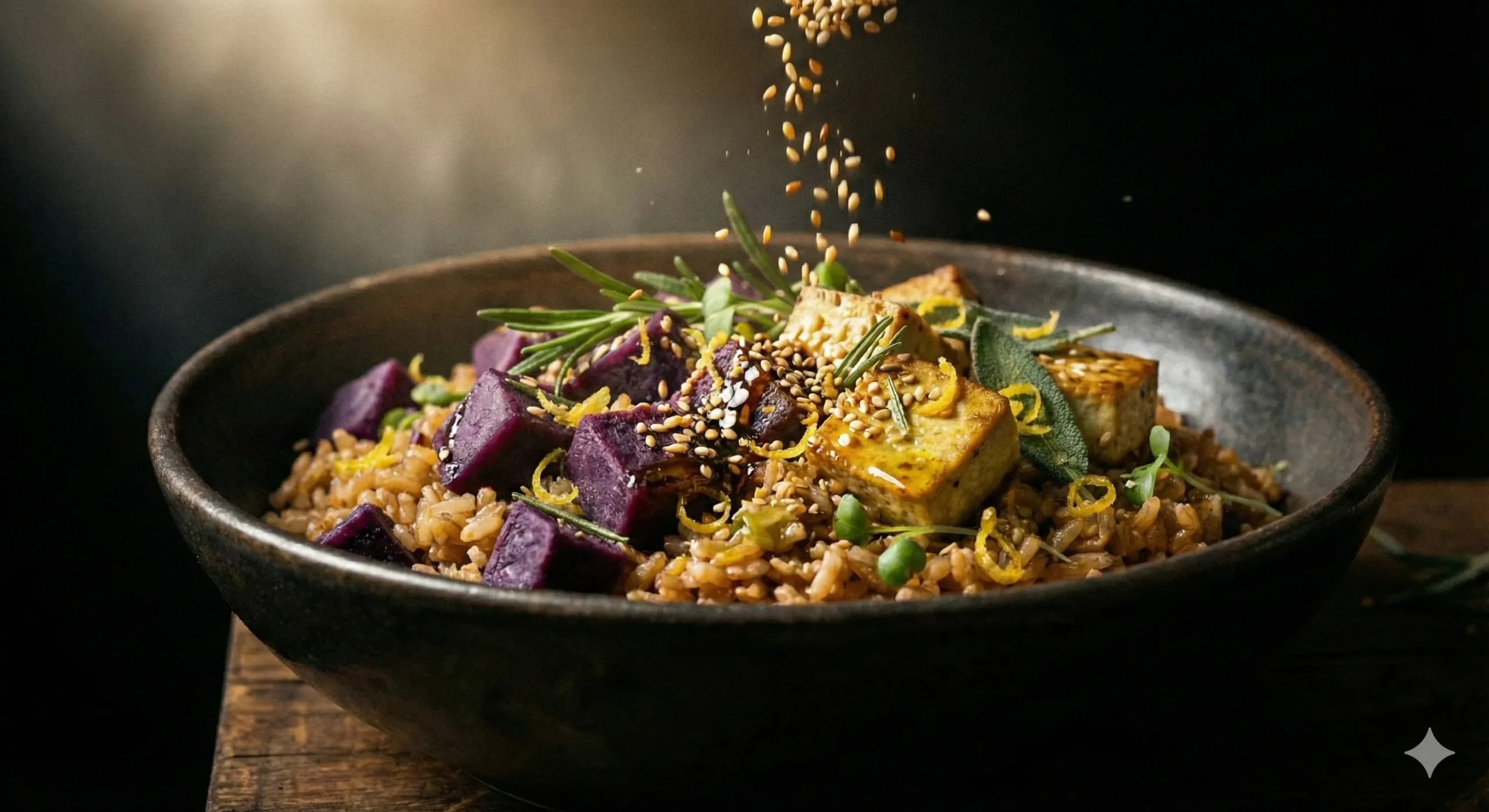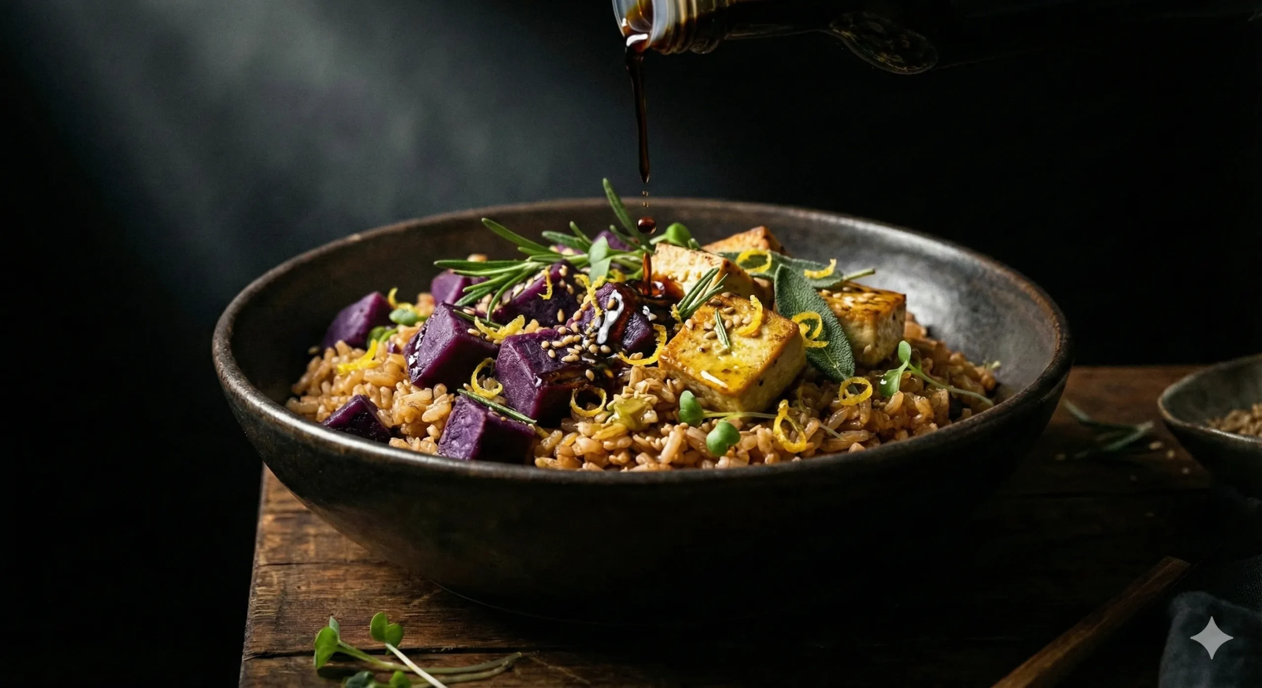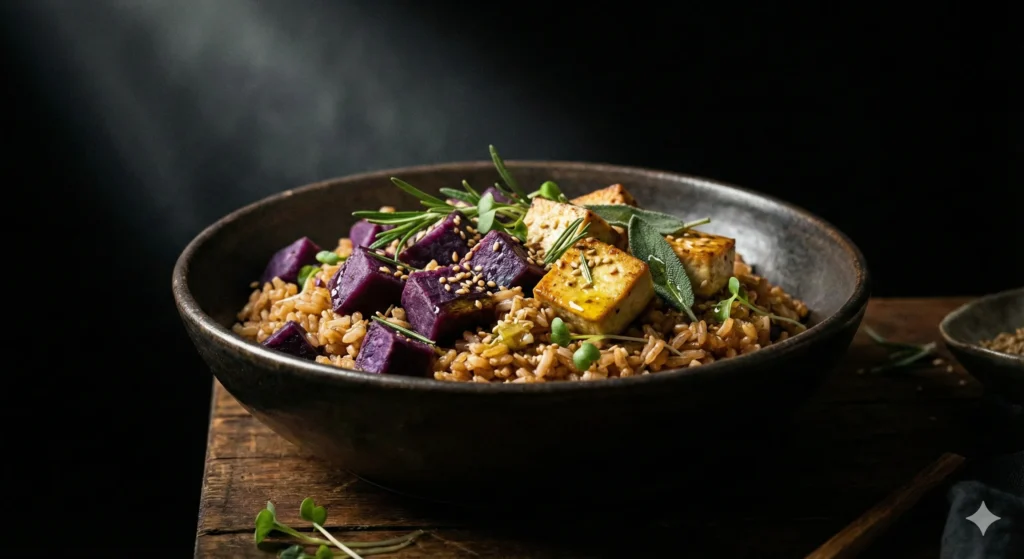 Cooking this pilaf is a ritual of presence. I begin by roasting or steaming the purple sweet potatoes, letting them keep their bright color and natural sweetness. The tofu browns gently in a pan, its edges catching the light as it firms. As rosemary and sage release their aroma, the kitchen fills with a fragrance that feels both grounding and uplifting—like a small window opening inside the mind.