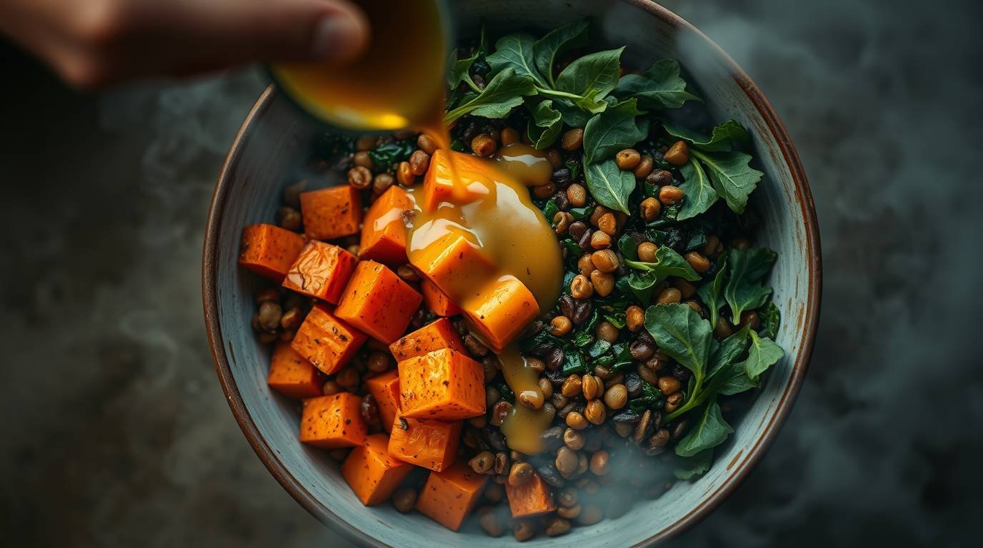 This warm winter salad combines sweet potatoes, carrots, and lentils with a golden adaptogen dressing for a healthy and hearty meal.