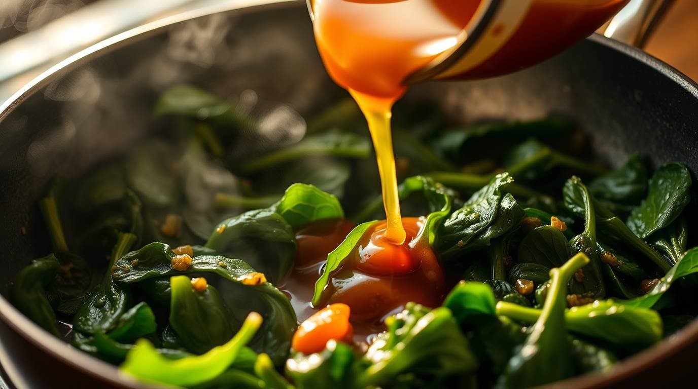 Pour the prepared glaze over the cooked spinach in the skillet. Stir well to coat the spinach evenly, then cook for an additional 1-2 minutes, until the glaze is slightly thickened.