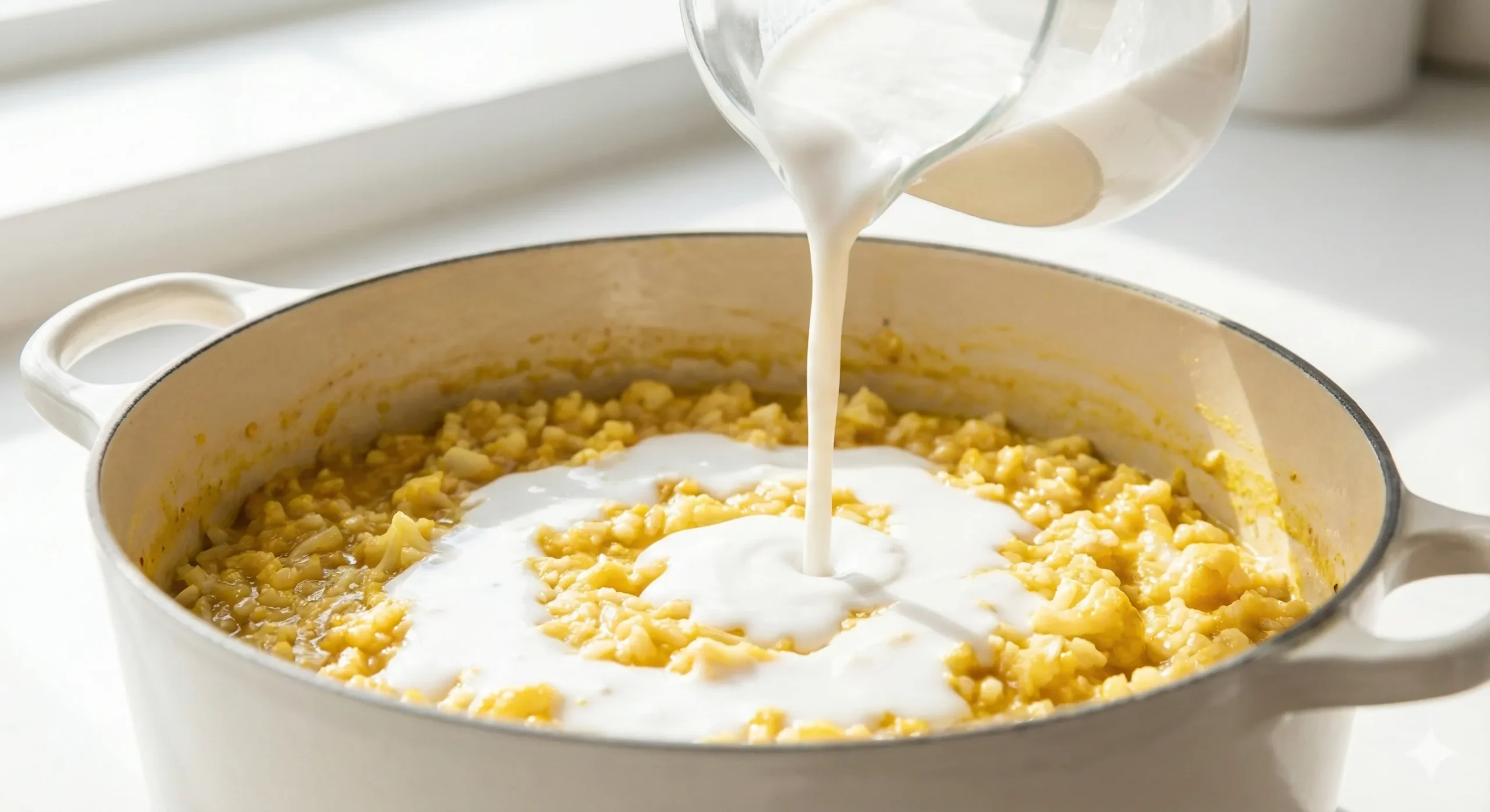 6. Pour in the warm vegetable broth and coconut milk, stirring gently. Bring the mixture to a simmer, reduce heat to low, and cover. Cook for 10-15 minutes, stirring occasionally, until the cauliflower is tender yet slightly al dente.