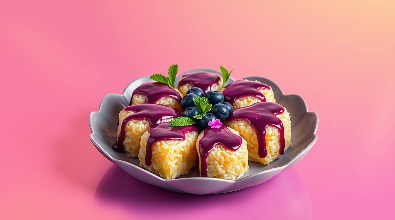 Photorealistic pineapple rice rolls on a lotus-shaped plate, drizzled with glossy blueberry glaze pinit