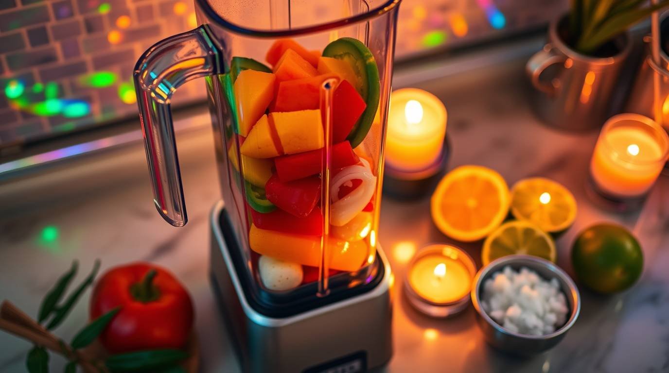In a blender, combine the diced mango, chopped carrots, cucumber, bell pepper, and onion. Add the juice of one lime and a generous pinch of salt.