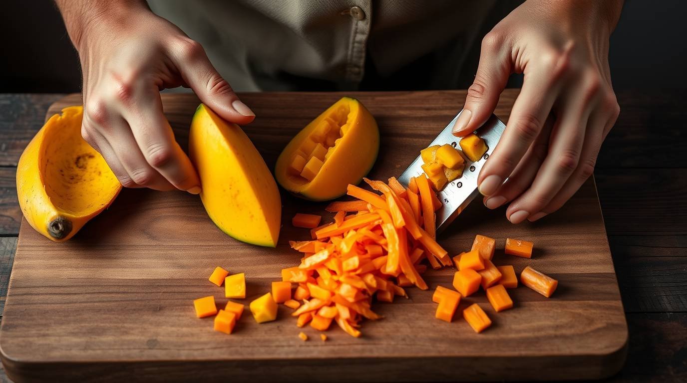 Begin by peeling the mangoes and carrots. Dice the mango into chunks, and grate or finely chop the carrots. This ensures that they blend smoothly into the gazpacho.