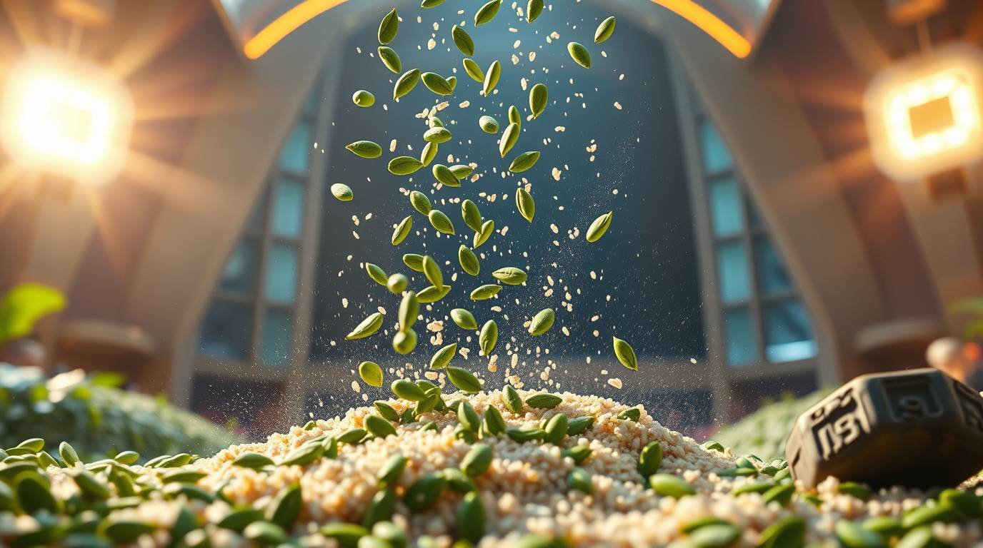 A cascade of green pumpkin seeds falls from a ceramic pinch bowl, caught mid-motion. The bright spirulina contrasts with the soft white of the quinoa. The image carries a sense of movement, life, and mineral resonance.
